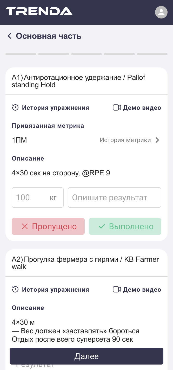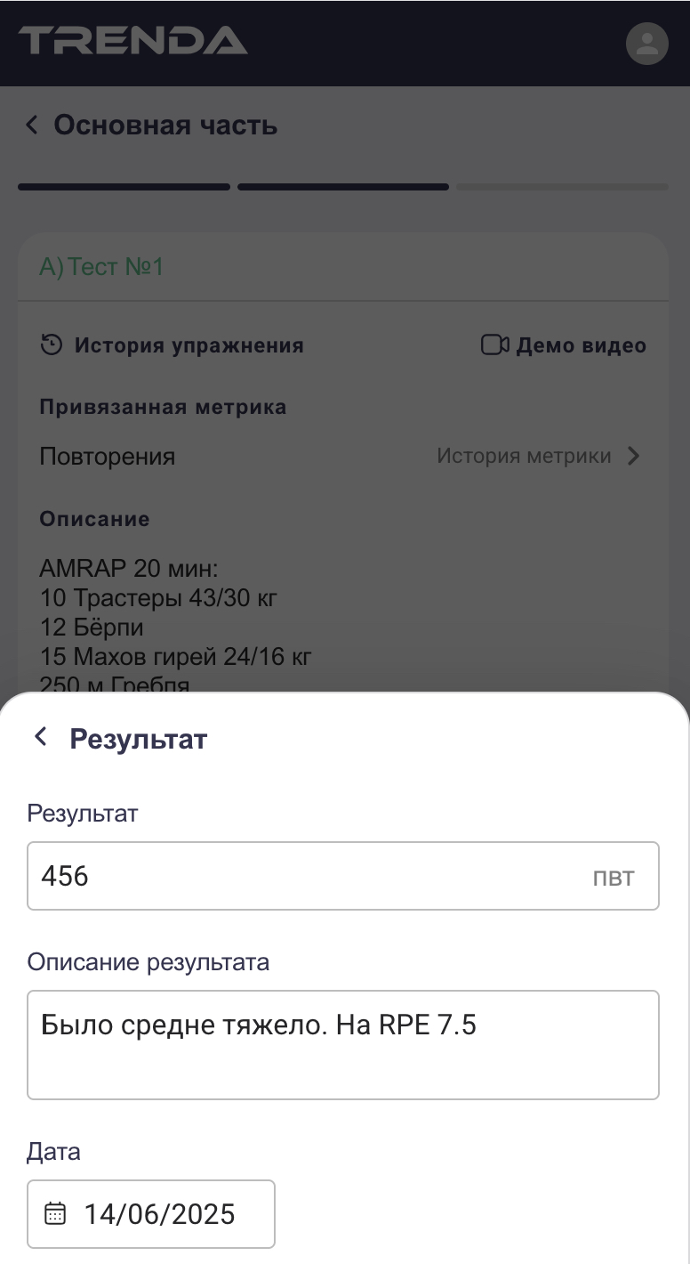После выполнения тренировки вы можете отметить её как завершённую. Все результаты запоминаются на этапе их записи и нажатия кнопки "Выполнено"