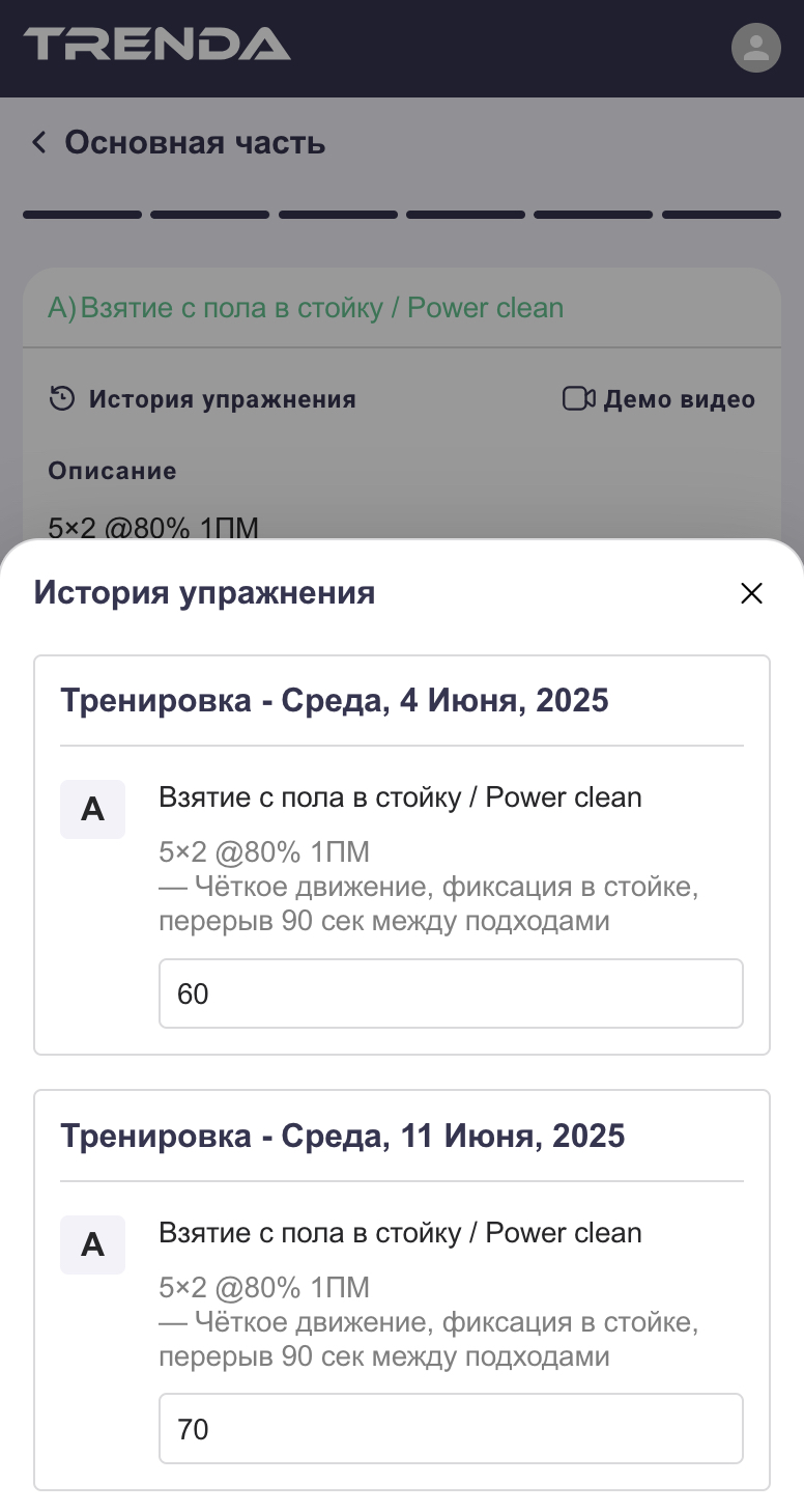 Ваши результаты сохраняются — вы можете в любой момент посмотреть историю по каждому движению и увидеть свой прогресс. Это особенно полезно, чтобы отслеживать личные рекорды, вес, повторения и общий объём нагрузки.