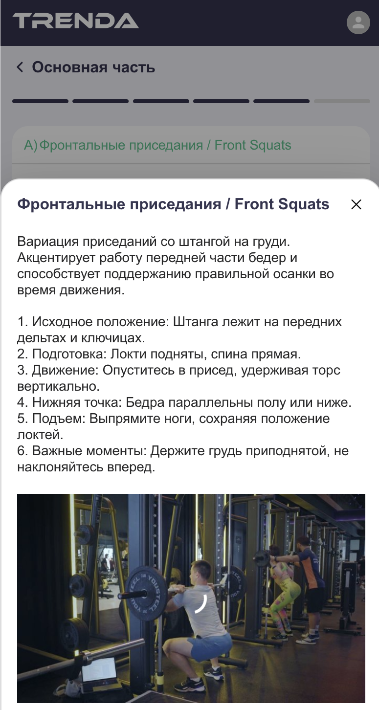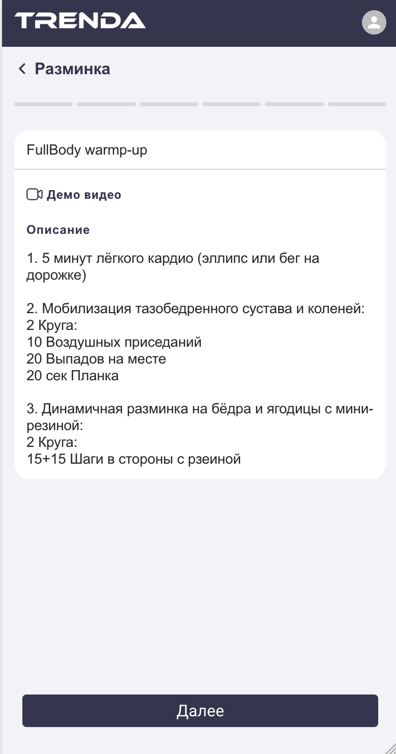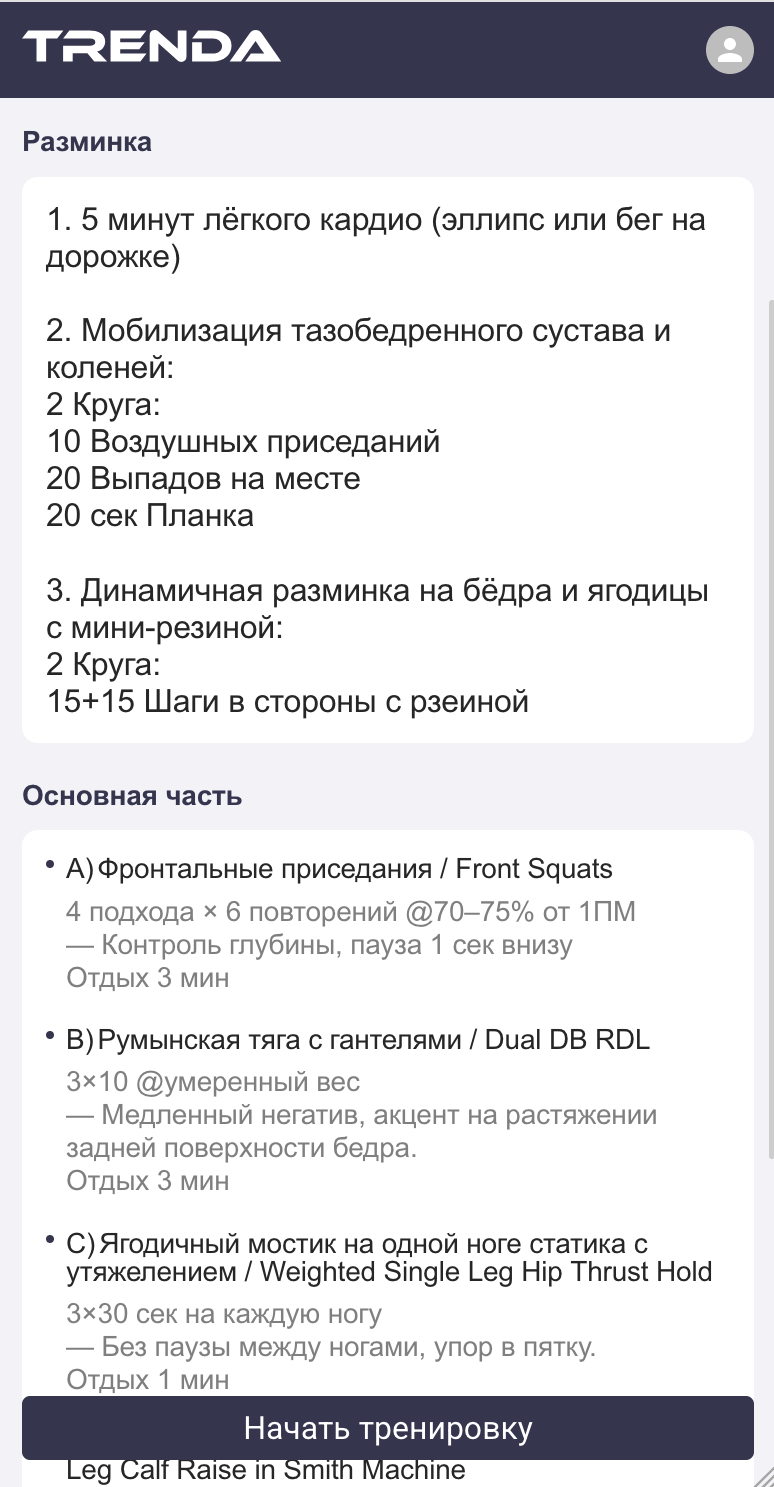 Когда вы нажимаете на тренировку в календаре, вы видите общий план: разминку, основную часть, упражнения. Чтобы начать, нажмите «Начать тренировку».