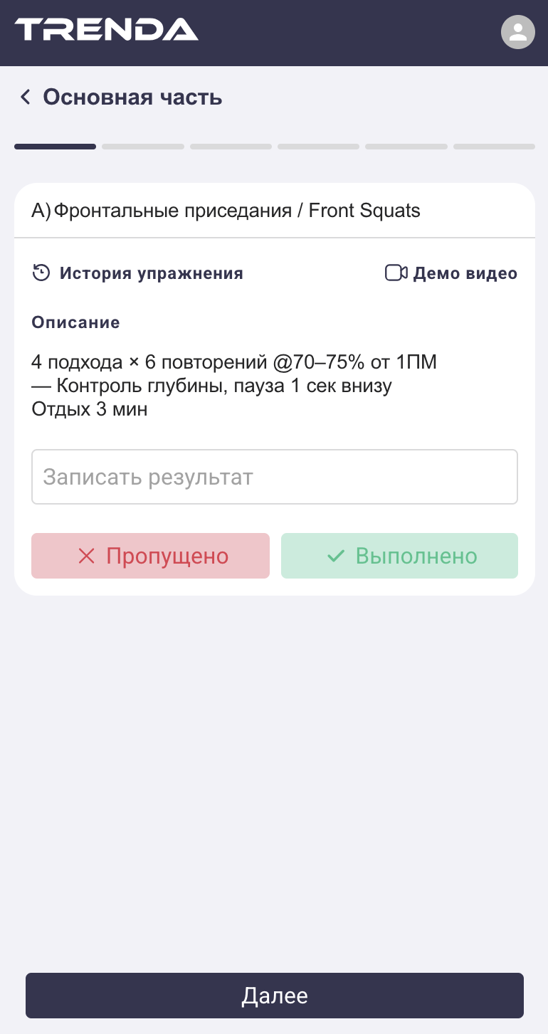 Кнопки «Пропущено» и «Выполнено» позволяют зафиксировать статус упражнения.