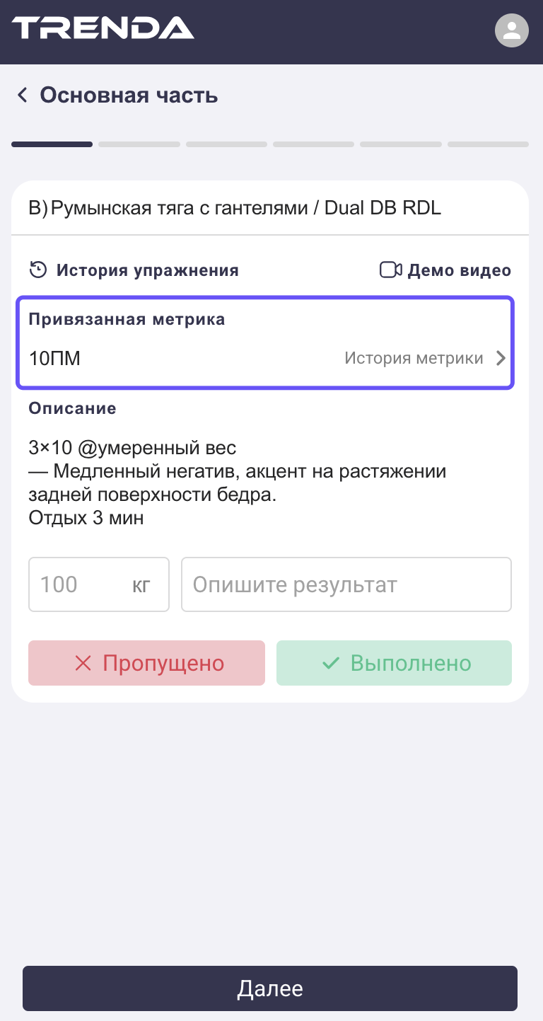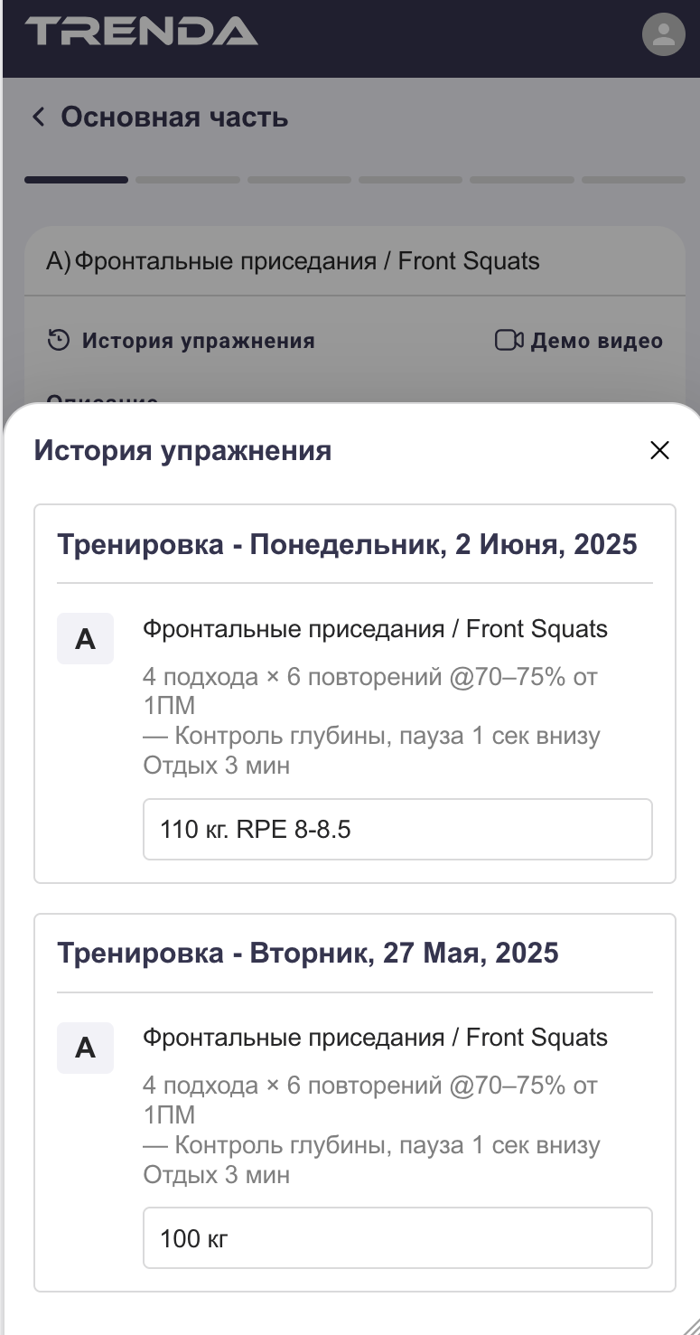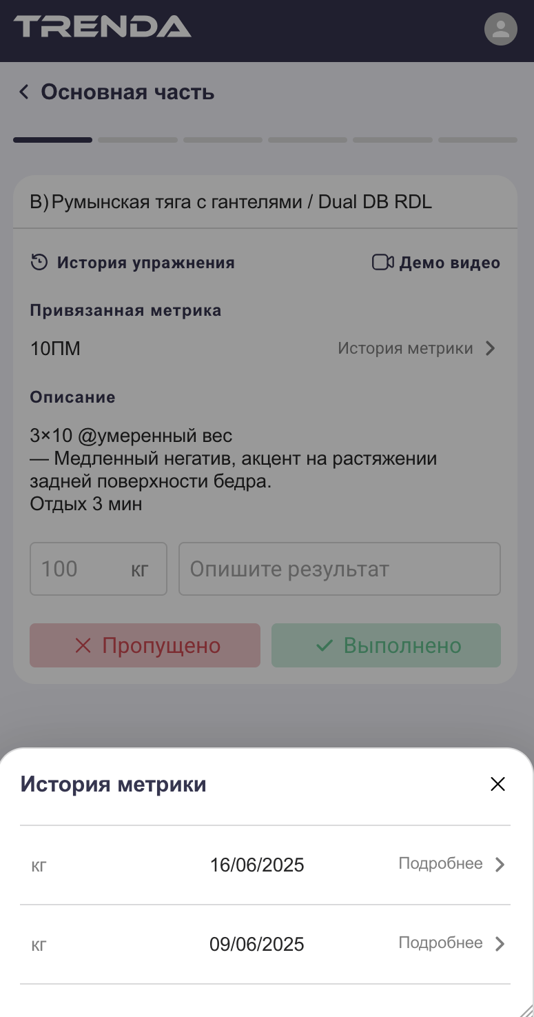 Если упражнение отмечено как метрика (например, 1ПМ или тест), вы увидите блок «Привязанная метрика» и сможете открыть её историю. Метрика - это, где тренер хочет зафиксировать ключевой результат либо напомнить о нем и от него отсчитывать нагрузку, грубо говоря - это история ваших тестов.