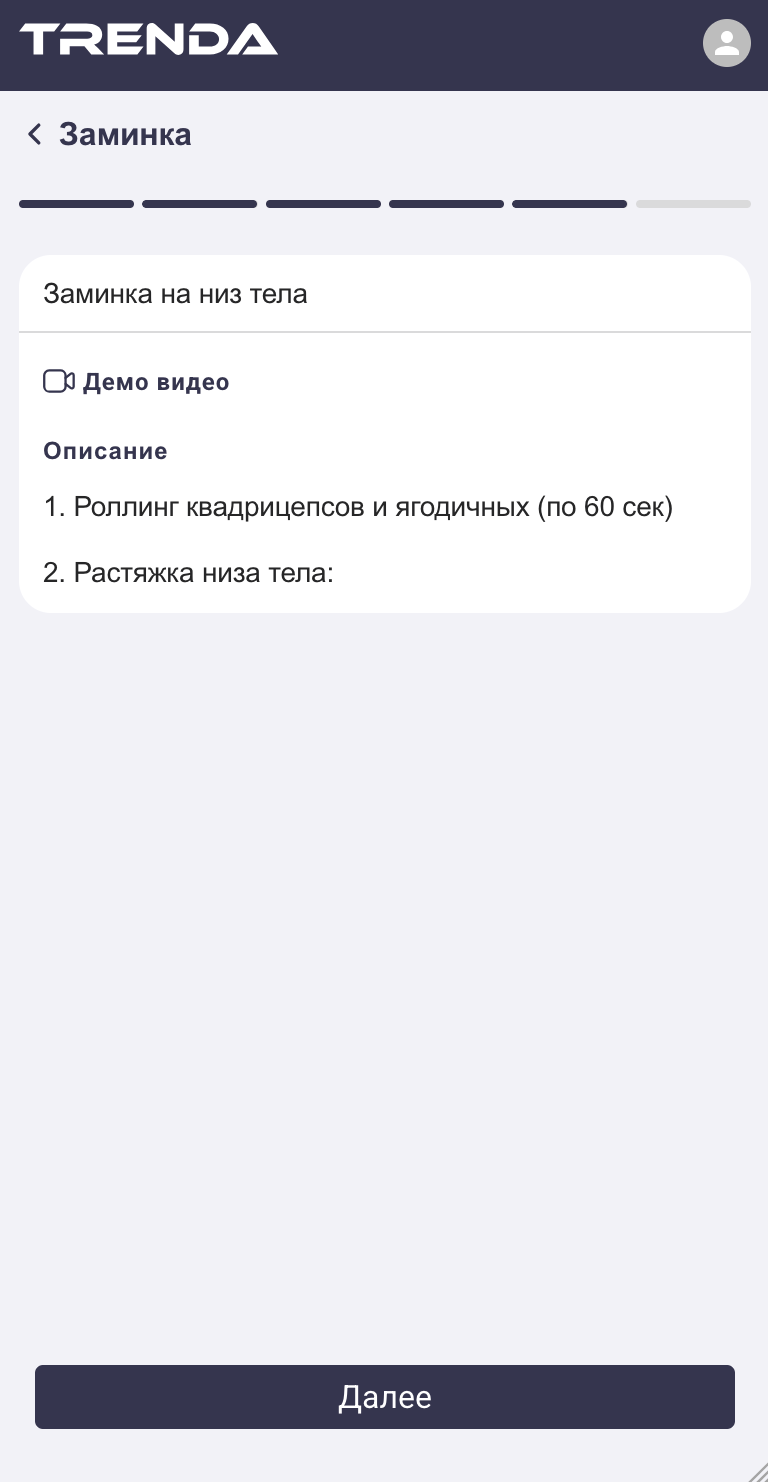 В конце тренировки откроется заминка. Она работает как разминка: с текстом и видео (если добавлены).