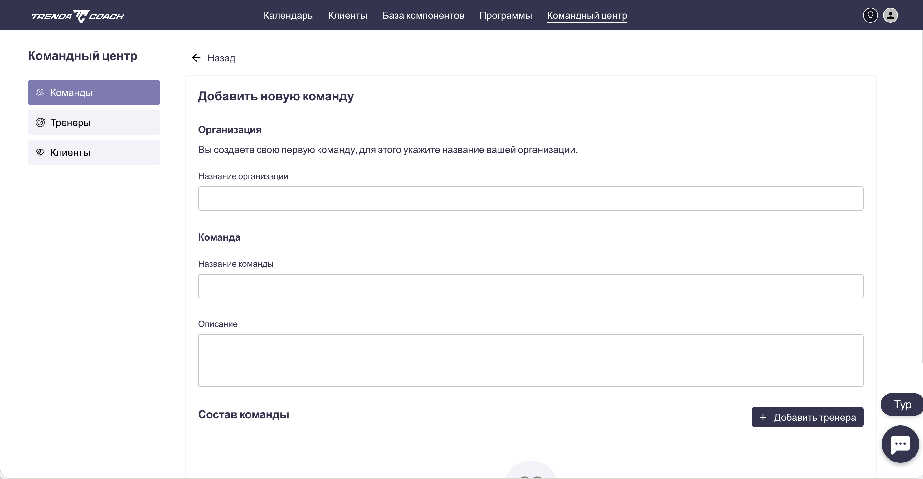 Если в команде пока один тренер (вы), система подскажет назначение клиентов на вас.