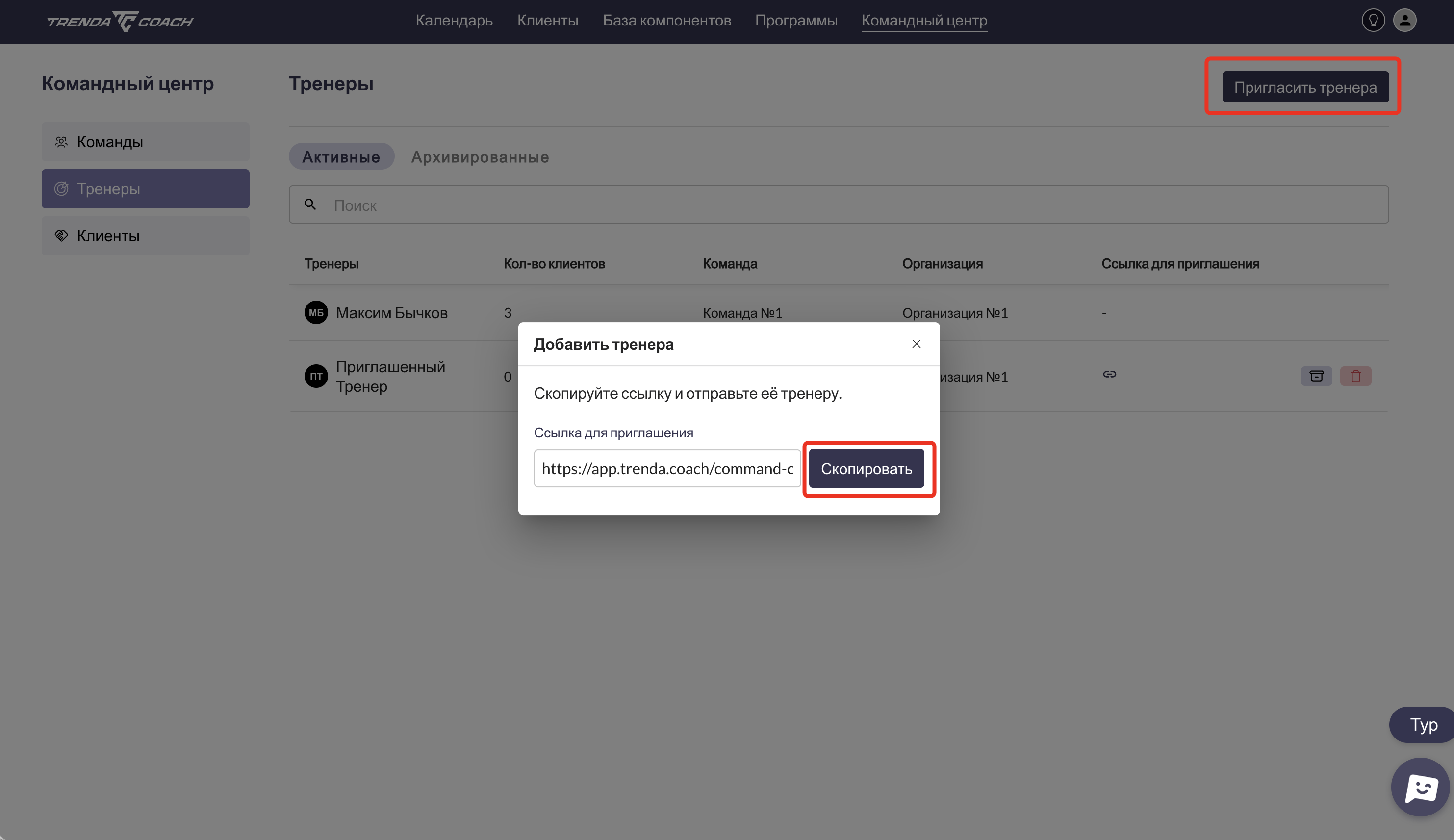 Приглашение тренеров идёт по ссылке-приглашению: тренер регистрируется/заходит и привязывается к вашей организации.