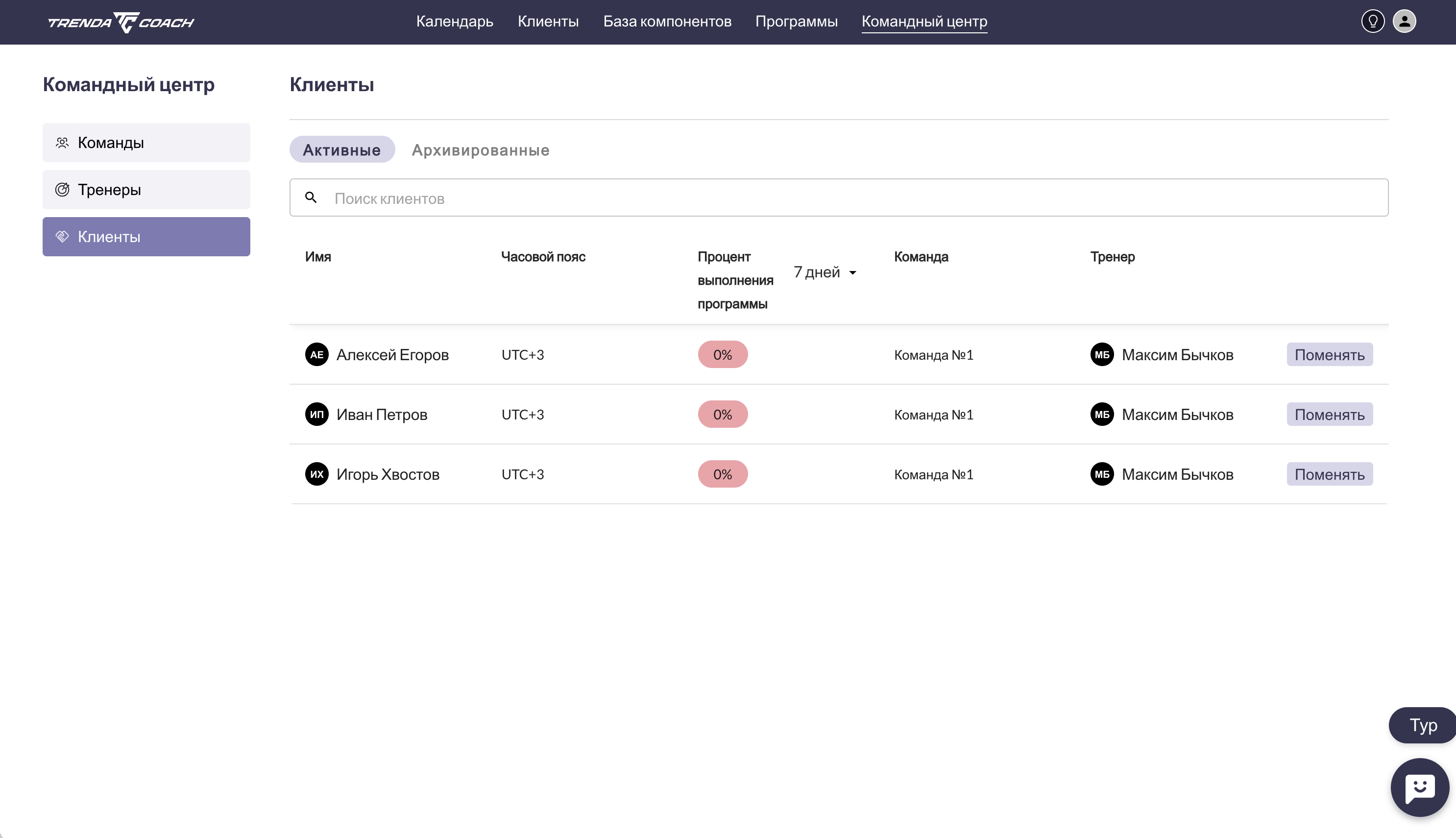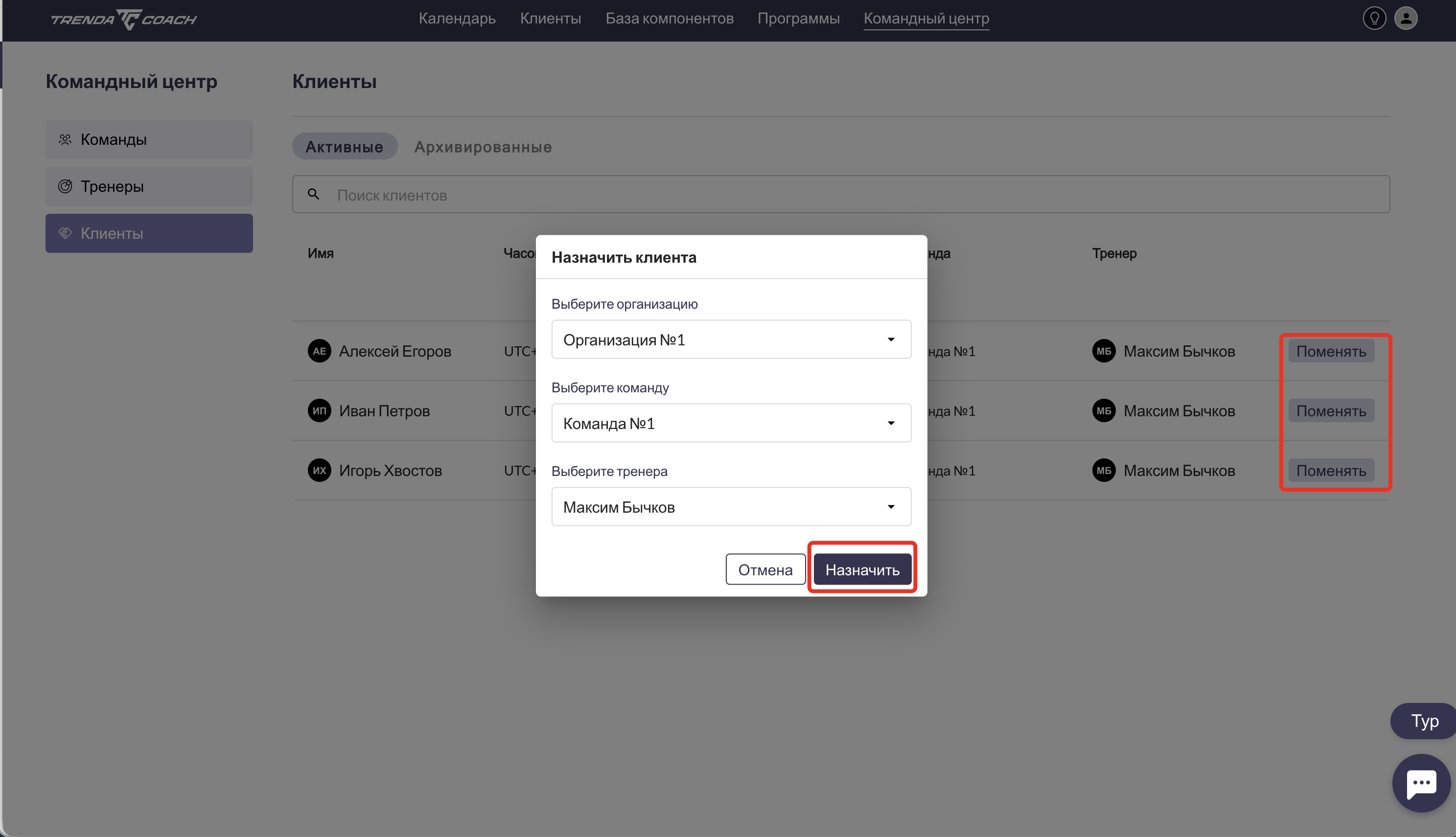 Выберите организацию → команду → тренера и назначьте клиентам ответственного тренера в выбранной команде.