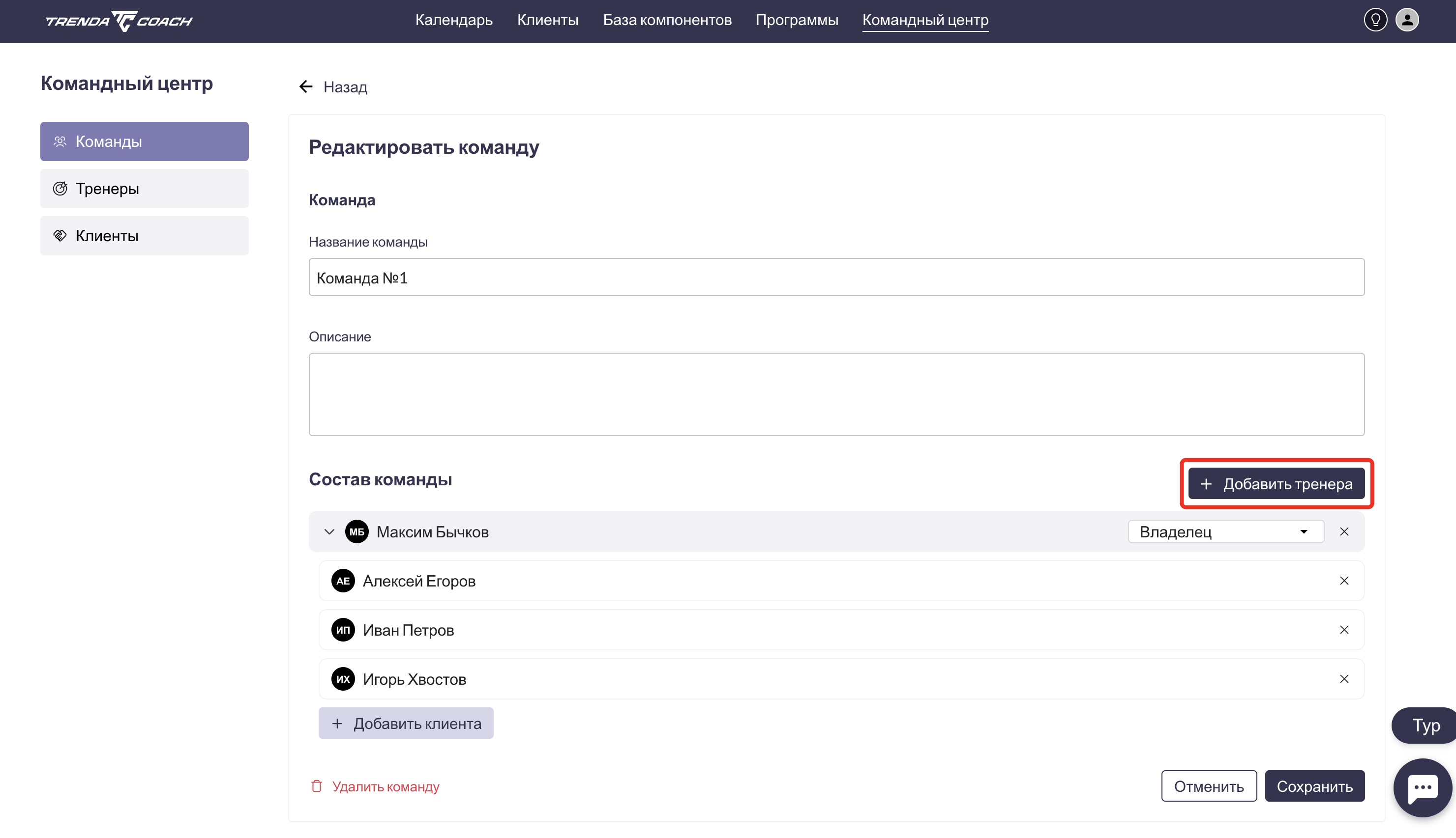 Быстрая правка: менять тренера/команду можно как из списка клиентов, так и прямо из экрана редактирования команды.